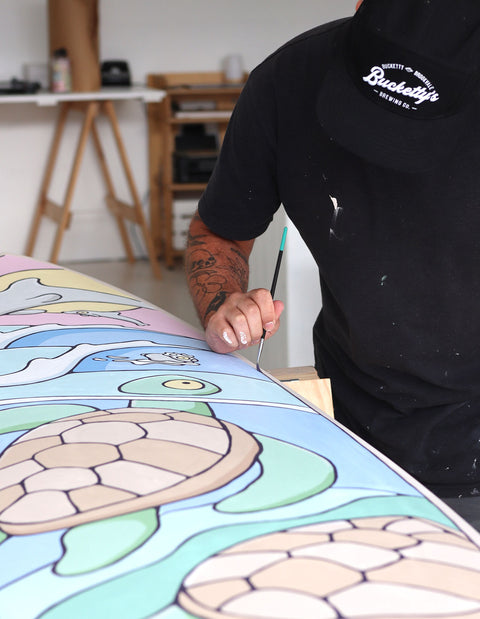 Brentos is a Sydney-based artist, designer, and picture book creator who finds endless inspiration in the Australian bush and coastline. His signature art style froths with colourful pastels, big surf vibes, cheeky wildlife characters and classic Aussie charm. Working with his partner Tash and studio dog Wally, they paint murals, design merch and collab with brands and charities that share their passion for championing the natural environment.