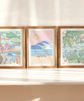 Celebrate your Aussie crew with this koala-filled coastal print trio. Featuring iconic scenes from Sydney to Noosa and a customisable koala family portrait, it’s the perfect blend of personal and playful. Surfboards, ferries, palm trees and all.