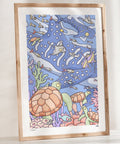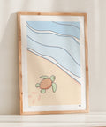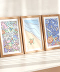 A baby turtle is balanced by two abundant underwater seascapes in this saltwater print trio.