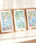 Palm trees, coral reefs and glassy waves – This is a set of prints with a strong tropical beach vibe to life the vibe in any space.