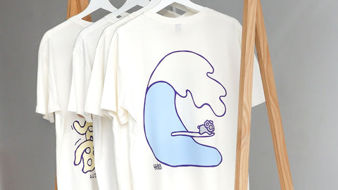 When the art is ready we hand it over to our studio neighbours who get to work on printing the tees. We use screenprinting for simpler designs and digital printing for more complex art. Both durable and longlasting.