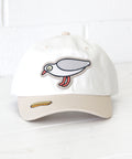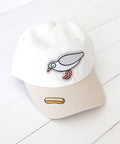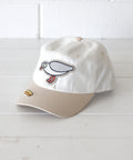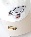 Who’s ready for a snack? This two-tone sand and white coloured dad hat captures a seagull’s dream moment—he’s spotted a chip, and he’s bloody goin for it! With a seagull patch on the front and a cheeky chip on the brim, it’s a classic hat for beachside fish and chip sessions.