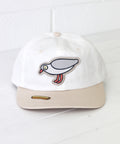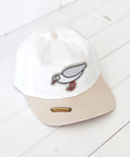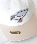 Who’s ready for a snack? This two-tone sand and white coloured dad hat captures a seagull’s dream moment—he’s spotted a chip, and he’s bloody goin for it! With a seagull patch on the front and a cheeky chip on the brim, it’s a classic hat for beachside fish and chip sessions.