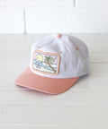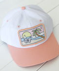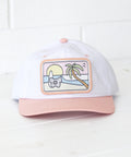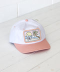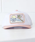 A surfing Koala sits on white sand admiring a set of juicy barrels rolling into a tropical paradise – all stitched onto the front of a classic salmon and white two-tone banger. A must-have for beach-goin' noggins.