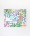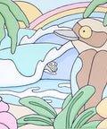 Waves barrel and break under a soft pastel sky as a tiny koala carves through the surf. A contemplative kookaburra watches the ocean serenity from the canopy, framed by tropical leaves and flowers, while a rainbow arcs across the horizon.
