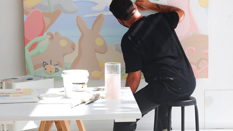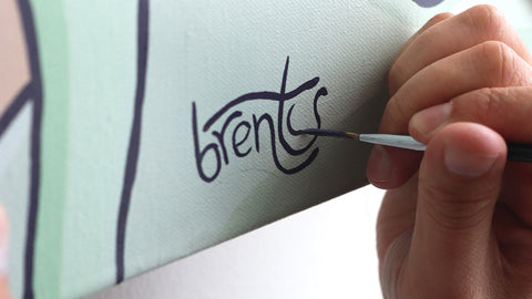 Brentos hand mixes professional-grade acrylic paints to make his signature colours. He then uses brush to apply to paint on 450gsm cotton canvas. Once the painting is finished, it's sealed with a light satin varnish.