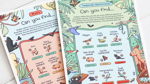 There are 13 seek-and-find art prints to collect. Each print explores a unique Australian habitat and the local wildlife that call each one home.