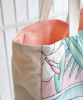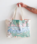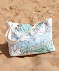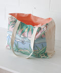 An oversized ultra thick canvas tote bag perfect for sunny beach days and picnics. The front features a classic Brentos surfing Koala artwork that's complimented beautifully by cream canvas around the back and sides, and peach inner lining to keep the sand out. The bags are extra large, measuring 46cm x 37cm x 16cm deep and will fit all the beach essentials.