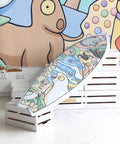 The artwork is handdrawn, blown-up and printed on a special fabric which is then glassed underneath the surface of the board. This means you can take the board out in the surf without risking paint chipping off or extra weight on the board.