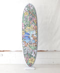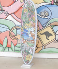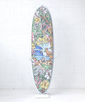The artwork is handdrawn, blown-up and printed on a special fabric which is then glassed underneath the surface of the board. This means you can take the board out in the surf without risking paint chipping off or extra weight on the board.