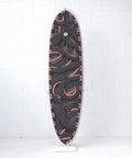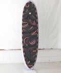 The artwork is handdrawn, blown-up and printed on a special fabric which is then glassed underneath the surface of the board. This means you can take the board out in the surf without risking paint chipping off or extra weight on the board.