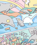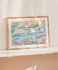 Dolphins and marine creatures play in the coral reef lagoon of Lord Howe Island as surfing koalas get pitted. An illustration adapted from Brentos' book Wild Australia. Also available in Landscape orientation here.