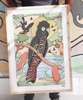 A family of black cockatoos are paired with a portrait of a red-tailed black cockatoo and a thriving Cradle Mountain inspired print. Choose your cockatoo family members, add your family name and Brentos will sign it with your family name.