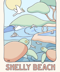 This poster features a Brentos artwork of iconic Shelly Beach located next to Manly Beach in Sydney featuring local marine life and landmarks with beautiful vintage typography underneath with the text 'Shelly Beach - Sydney Australia'.